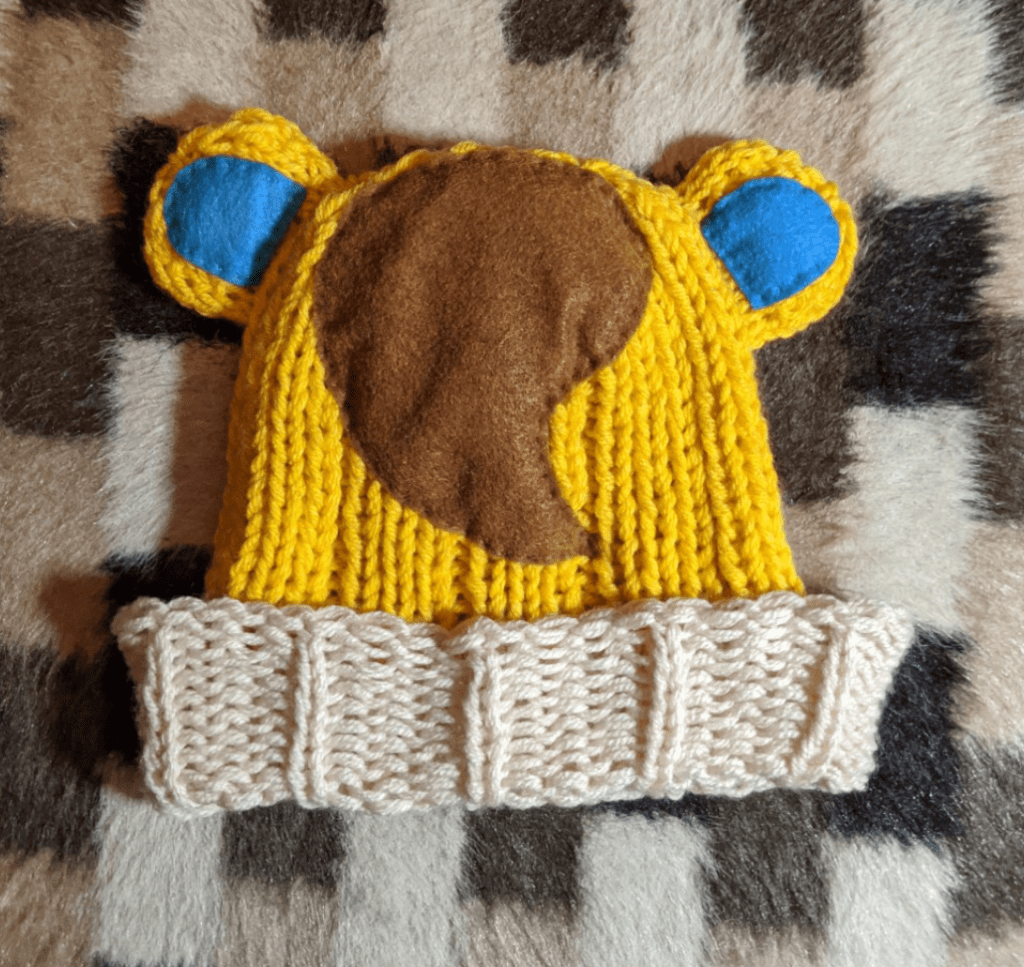 It’s so cute! What else is there to say? This is a simple 3 x 1 rib beanie with ears added on and finished off with felt appliques.